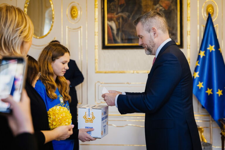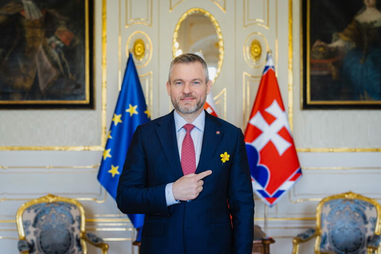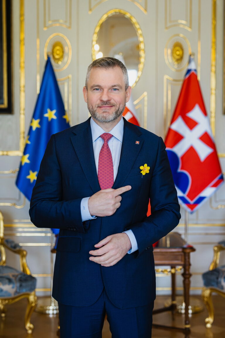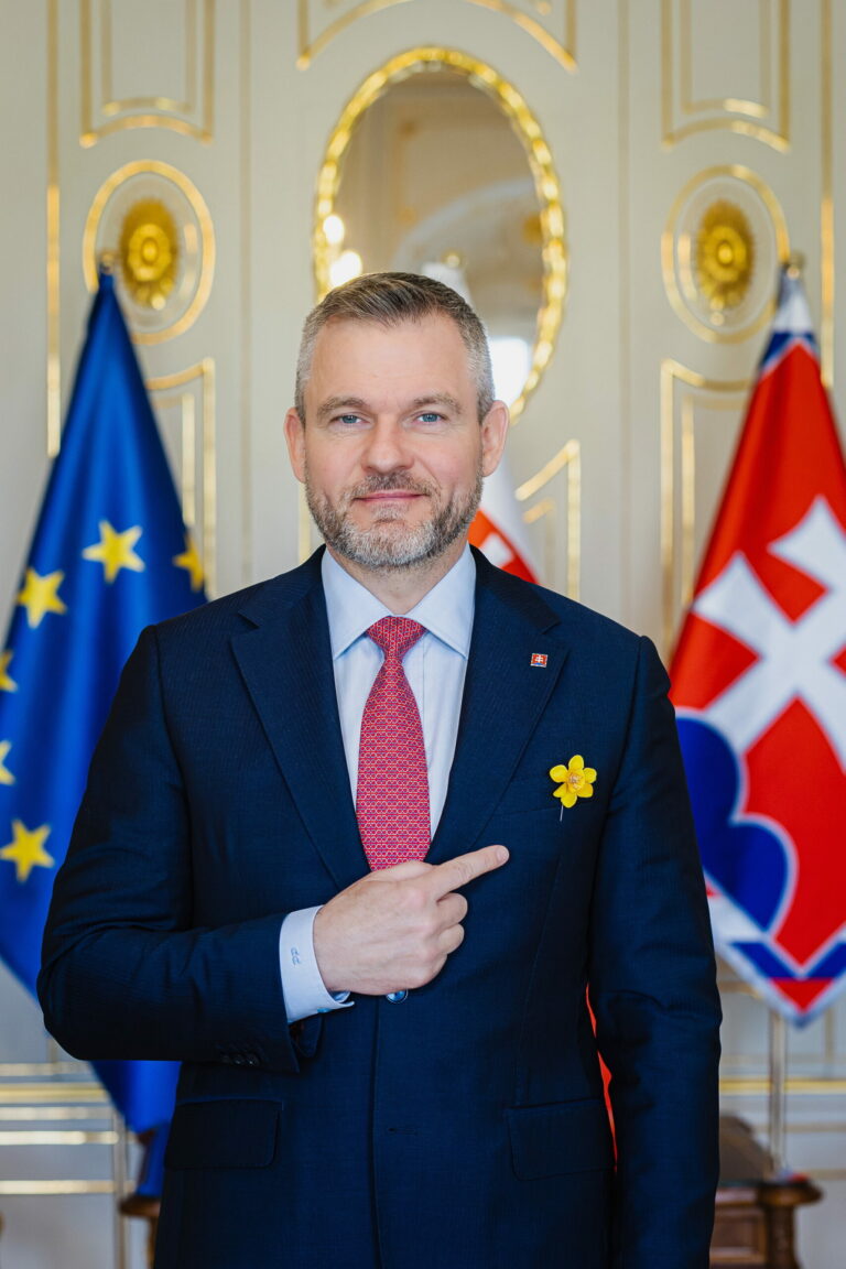 Prezident SR Peter Pellegrini (vpravo) počas prijatia zástupcov Ligy proti rakovine (LPR) pri príležitosti Dňa narcisov v Prezidentskom paláci. Pripnutím žltého narcisu v rámci verejno-prospešnej zbierky Ligy proti rakovine vyjadrujeme podporu a spolupatričnosť s onkologickými pacientmi. Bratislava, 10. apríl 2025. Foto: SITA/Kancelária prezidenta