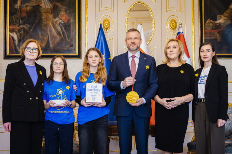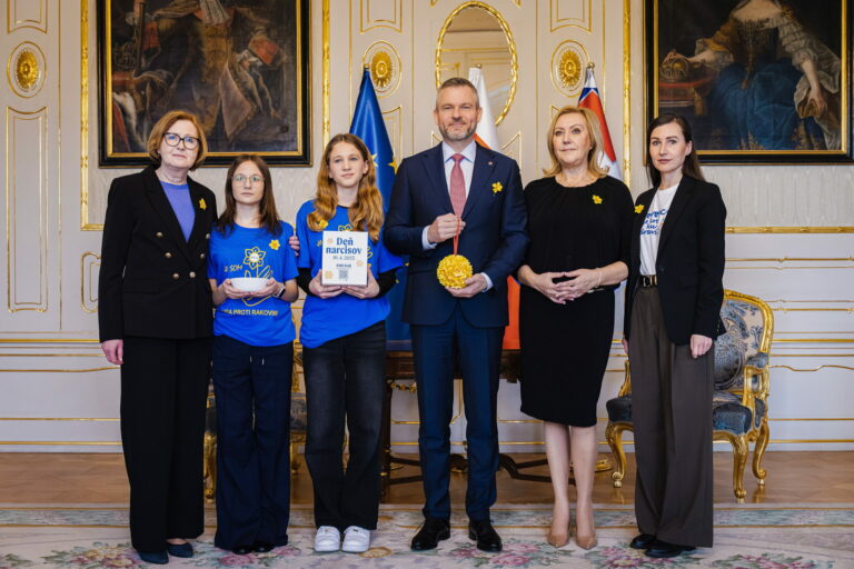Riaditeľka Ligy proti rakovine Eva Kováčová (druhá sprava) a prezident SR Peter Pellegrini (tretí sprava) počas prijatia zástupcov Ligy proti rakovine (LPR) pri príležitosti Dňa narcisov v Prezidentskom paláci. Pripnutím žltého narcisu v rámci verejno-prospešnej zbierky Ligy proti rakovine vyjadrujeme podporu a spolupatričnosť s onkologickými pacientmi. Bratislava, 10. apríl 2025. Foto: SITA/Kancelária prezidenta