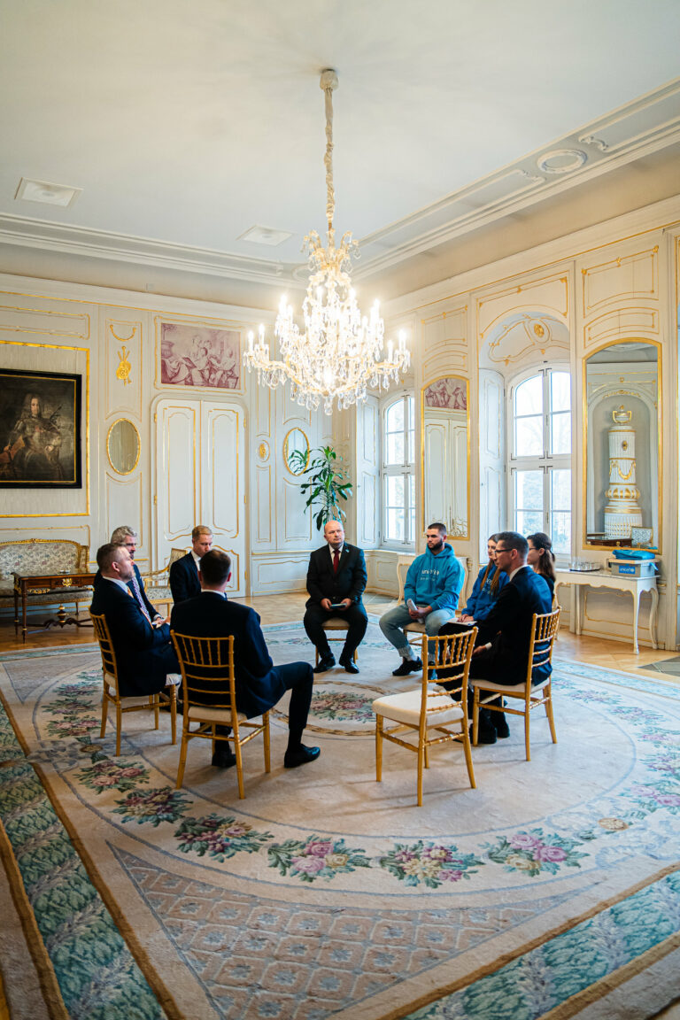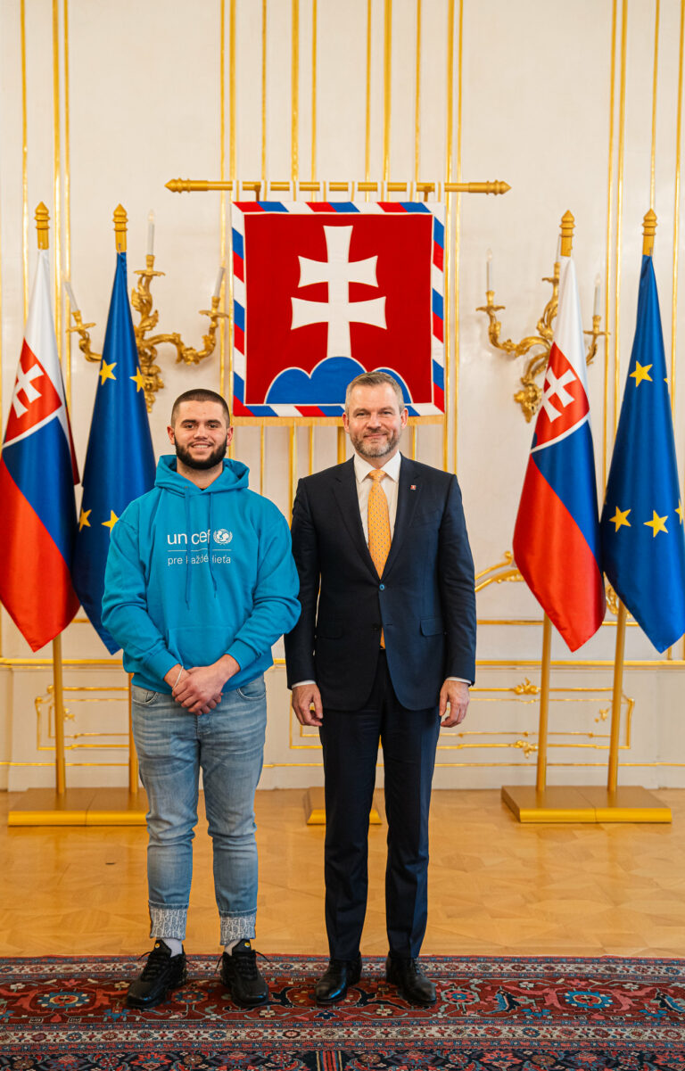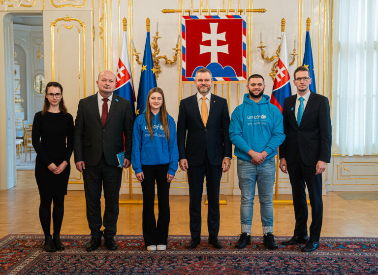 Prezident SR Peter Pellegrini (vpravo) počas stretnutia prezidenta SR s účastníkmi medzinárodného projektu UNICEF Kids Takeover v Prezidentskom paláci pri príležitosti Svetového dňa detí. Bratislava, 20. november 2024. Foto: SITA/Kancelária prezidenta SR