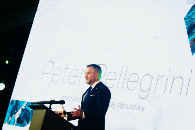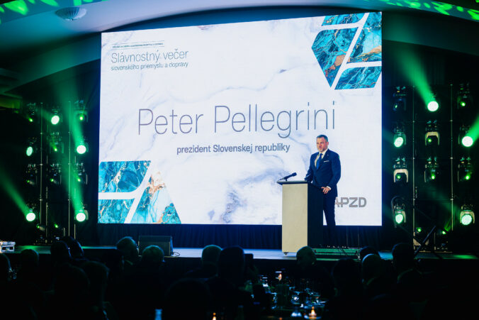 Prezident SR Peter Pellegrini počas slávnostného večera slovenského priemyslu a dopravy organizovaného Asociáciou priemyselných zväzov a dopravy (APZD) v DoubleTree by Hilton v Bratislave. Bratislava, 10. november 2025. Foto: SITA/Kancelária prezidenta SR