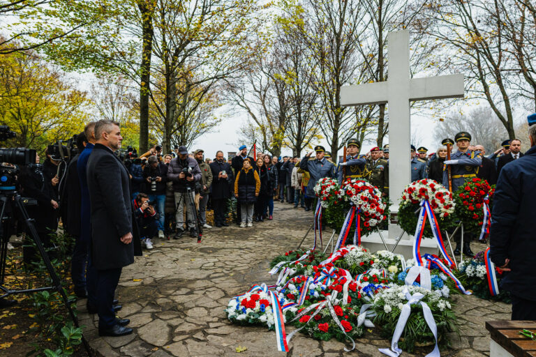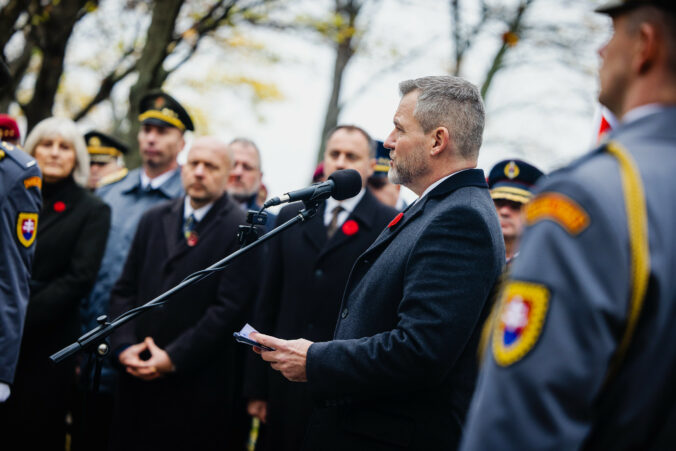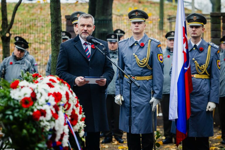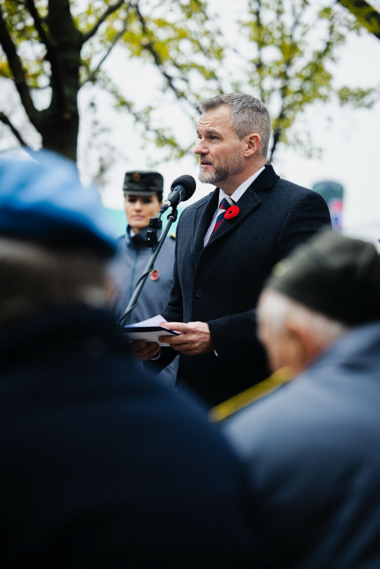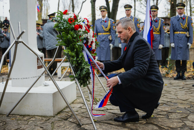 Prezident SR Peter Pellegrini počas pietneho aktu kladenia vencov pri príležitosti Medzinárodného dňa vojnových veteránov na Cintoríne prvej svetovej vojny Kopčany v Petržalke. Bratislava, 11. november 2025. Foto: SITA/Kancelária prezidenta SR