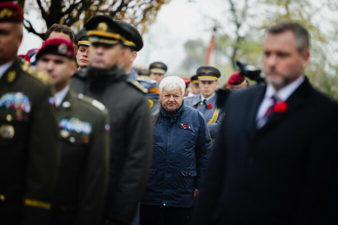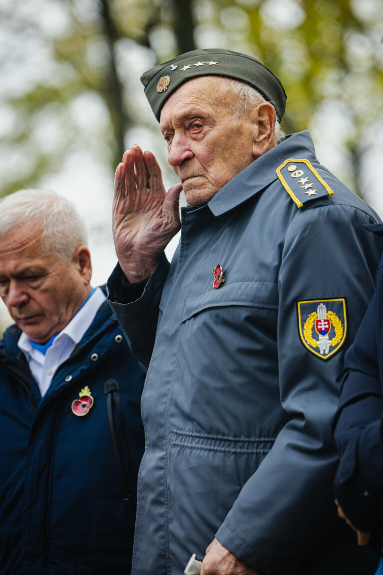 Vojnový veterán a účastník Slovenského národného povstania (SNP) Branislav Tvarožek (vpravo) počas pietneho aktu kladenia vencov za účasti prezidenta SR pri príležitosti Medzinárodného dňa vojnových veteránov na Cintoríne prvej svetovej vojny Kopčany v Petržalke. Bratislava, 11. november 2025. Foto: SITA/Kancelária prezidenta SR