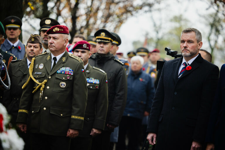 Prezident SR Peter Pellegrini (v popredí vľavo) počas pietneho aktu kladenia vencov pri príležitosti Medzinárodného dňa vojnových veteránov na Cintoríne prvej svetovej vojny Kopčany v Petržalke. Bratislava, 11. november 2025. Foto: SITA/Kancelária prezidenta SR