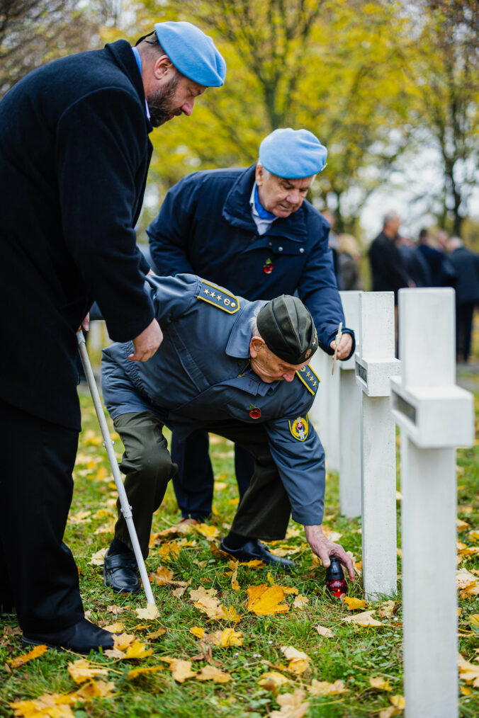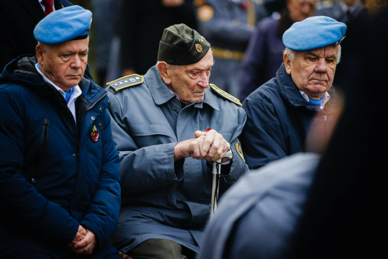 Vojnový veterán a účastník Slovenského národného povstania (SNP) Branislav Tvarožek (v popredí) počas pietneho aktu kladenia vencov za účasti prezidenta SR pri príležitosti Medzinárodného dňa vojnových veteránov na Cintoríne prvej svetovej vojny Kopčany v Petržalke. Bratislava, 11. november 2025. Foto: SITA/Kancelária prezidenta SR