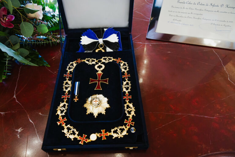Štátne vyznamenanie Veľká reťaz princa Henricha, ktoré udelil prezident Portugalska prezidentovi Slovenskej republiky v Národnom paláci Belém. Pri tejto príležitosti tiež prezident Slovenska udelil Rád Bieleho dvojkríža I. triedy prezidentovi Portugalska. Lisabon, Portugalská republika, 26. november 2025. Foto: SITA/Kancelária prezidenta SR