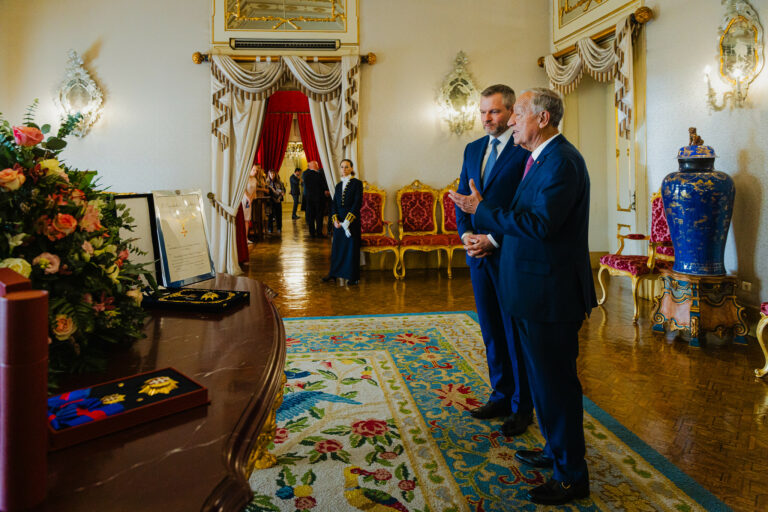 Sprava: Prezident Portugalska Marcelo Rebelo de Sousa a prezident Slovenska Peter Pellegrini počas udelenia štátneho vyznamenania Veľkej reťaze princa Henricha prezidentovi Slovenskej republiky a udelenia Radu Bieleho dvojkríža I. triedy, občianskeho druhu prezidentovi Portugalska v Národnom paláci Belém. Lisabon, Portugalská republika, 26. november 2025. Foto: SITA/Kancelária prezidenta SR
