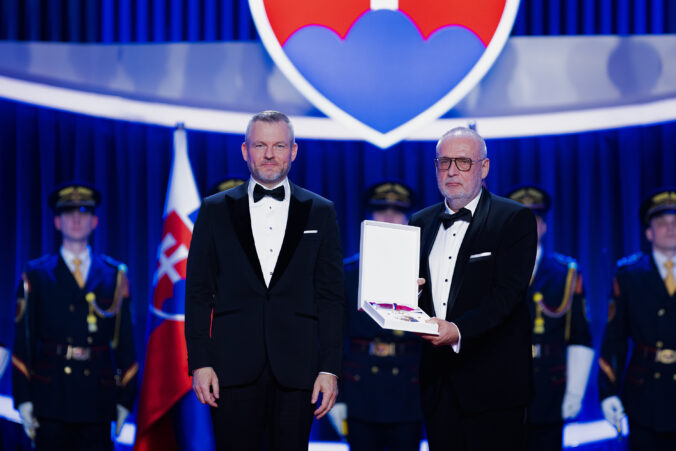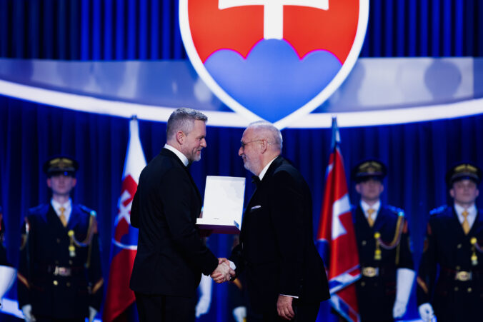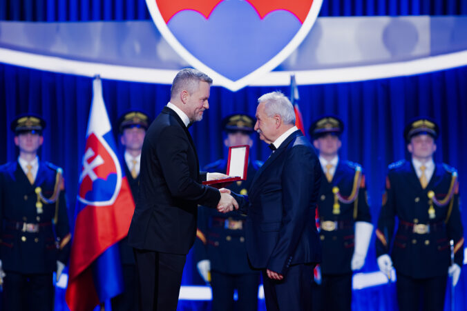 V popredí zľava: Prezident SR Peter Pellegrini a Ján Kothaj, syn lekára - chiruga Petra Kothaja, ktorému bol udelený Rad Ľudovíta Štúra I. triedy, občiansky druh, in memoriam, za mimoriadne zásluhy o rozvoj Slovenskej republiky v oblasti vedy a techniky, najmä v oblasti chirurgie počas udeľovania štátnych vyznamenaní osobnostiam z rôznych oblastí spoločenského života pri príležitosti 33. výročia vzniku Slovenskej republiky v Koncertnej sieni Slovenskej filharmónie. Bratislava, 10. január 2026. Foto: SITA/Kancelária prezidenta SR
