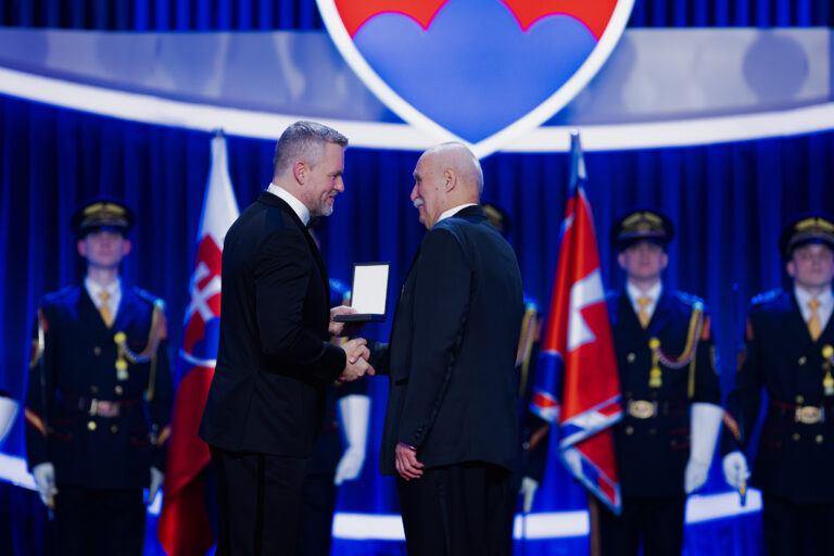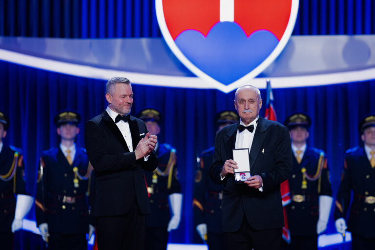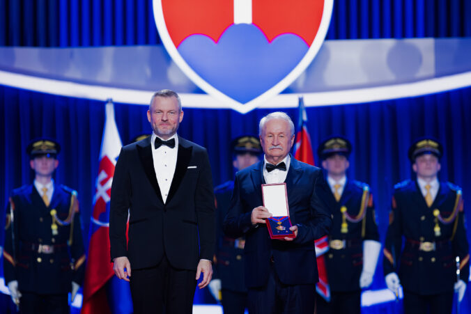V popredí zľava: Prezident SR Peter Pellegrini a lekár, dekan Lekárskej fakulty Univerzity Komenského (UK) v Bratislave Juraj Payer, ktorému bol udelený Rad Ľudovíta Štúra I. triedy, občiansky druh, za mimoriadne zásluhy o rozvoj Slovenskej republiky v oblasti vedy a techniky počas udeľovania štátnych vyznamenaní osobnostiam z rôznych oblastí spoločenského života pri príležitosti 33. výročia vzniku Slovenskej republiky v Koncertnej sieni Slovenskej filharmónie. Bratislava, 10. január 2026. Foto: SITA/Kancelária prezidenta SR