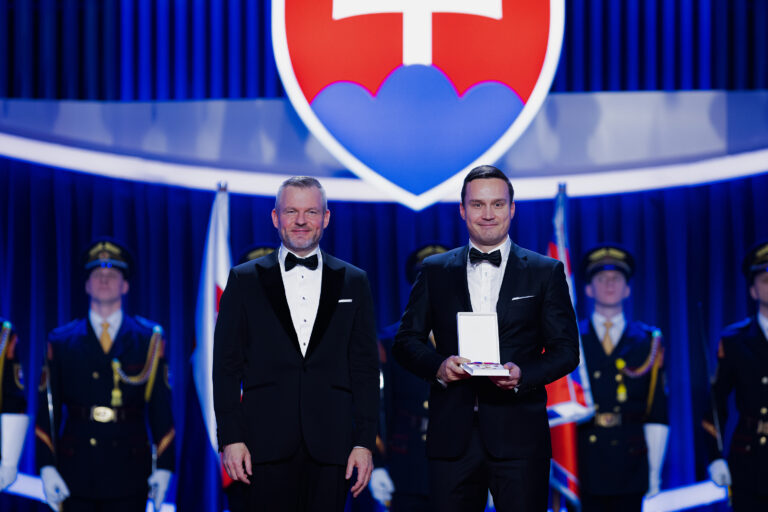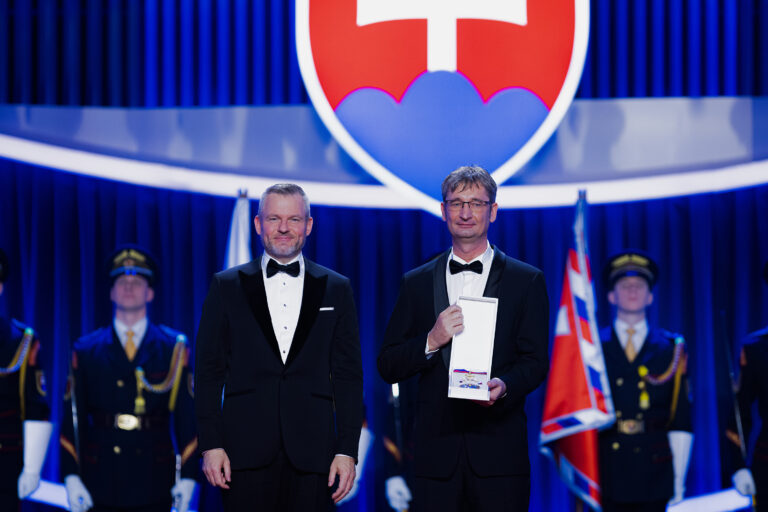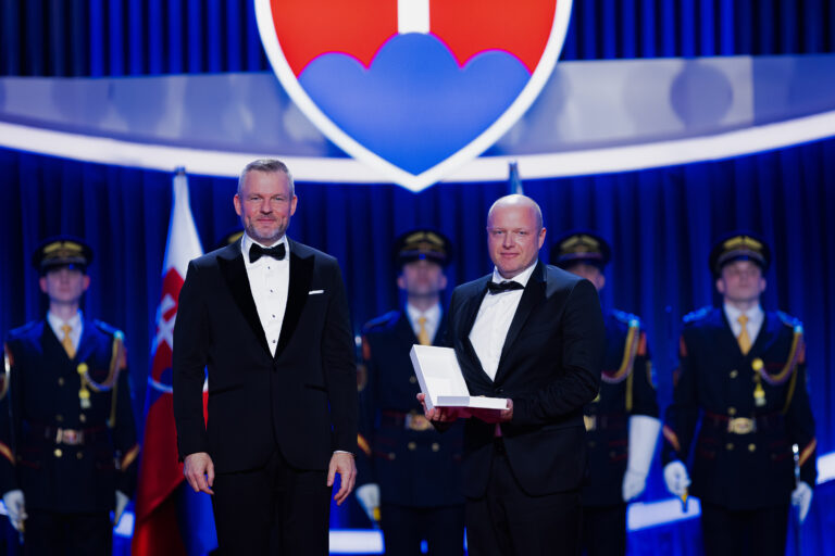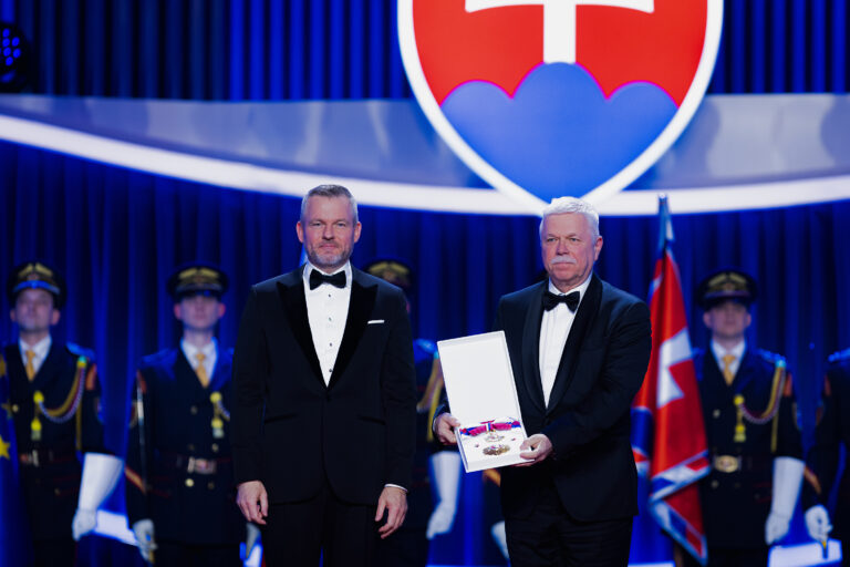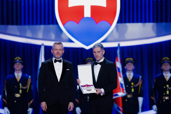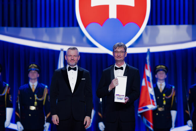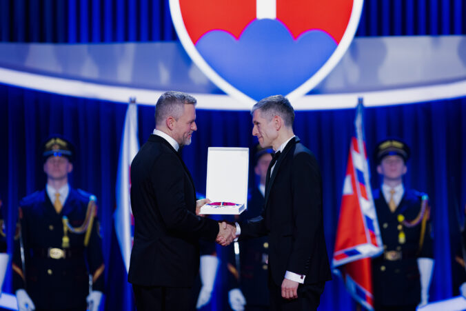 V popredí zľava: Prezident SR Peter Pellegrini a vedec Ján Tkáč, ktorému bol udelený Rad Ľudovíta Štúra II. triedy, občiansky druh, za mimoriadne zásluhy o rozvoj Slovenskej republiky v oblasti vedy a techniky, najmä v oblasti nanobiotechnológií, ako aj za mimoriadne šírenie dobrého mena Slovenskej republiky v zahraničí počas udeľovania štátnych vyznamenaní osobnostiam z rôznych oblastí spoločenského života pri príležitosti 33. výročia vzniku Slovenskej republiky v Koncertnej sieni Slovenskej filharmónie. Bratislava, 10. január 2026. Foto: SITA/Kancelária prezidenta SR