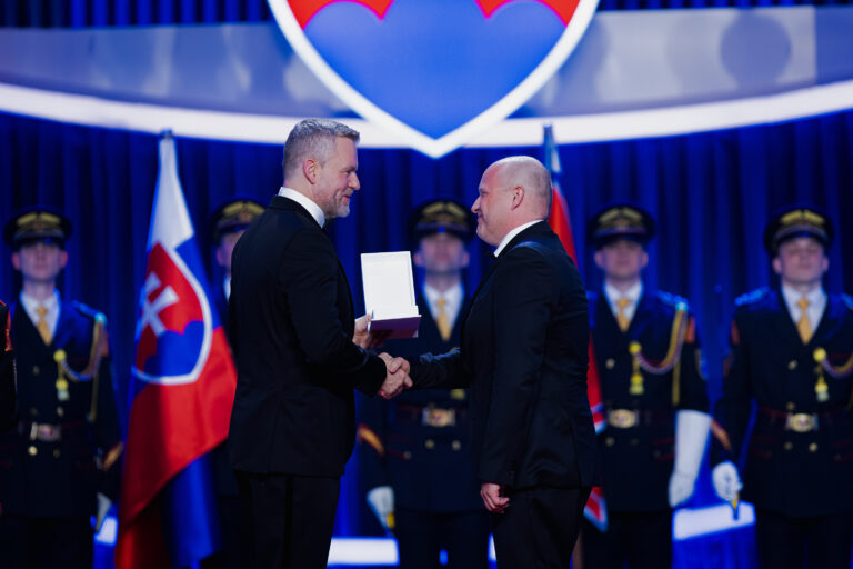 V popredí zľava: Prezident SR Peter Pellegrini a choreograf, pedagóg Emil Tomáš Bartko, ktorému bol udelený Pribinov kríž II. triedy, za mimoriadne zásluhy o kultúrny rozvoj Slovenskej republiky, najmä v oblasti tanečného umenia počas udeľovania štátnych vyznamenaní osobnostiam z rôznych oblastí spoločenského života pri príležitosti 33. výročia vzniku Slovenskej republiky v Koncertnej sieni Slovenskej filharmónie. Bratislava, 10. január 2026. Foto: SITA/Kancelária prezidenta SR