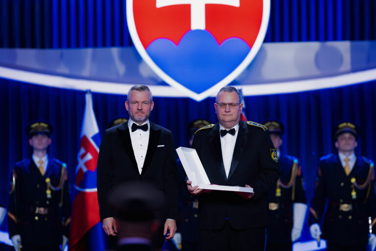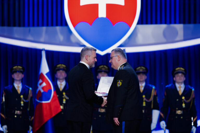 V popredí zľava: Prezident SR Peter Pellegrini a Milan Lehotský, vnuk účastníka SNP Daniela Lehotského, ktorému bol udelený Rad Ľudovíta Štúra III. triedy, vojenský druh, za mimoriadne zásluhy o obranu a bezpečnosť Slovenskej republiky počas udeľovania štátnych vyznamenaní osobnostiam z rôznych oblastí spoločenského života pri príležitosti 33. výročia vzniku Slovenskej republiky v Koncertnej sieni Slovenskej filharmónie. Bratislava, 10. január 2026. Foto: SITA/Kancelária prezidenta SR