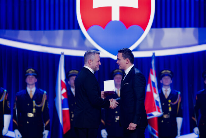 V popredí zľava: Prezident SR Peter Pellegrini a dizajnér automobilov Branislav Maukš, ktorému bol udelený Rad Ľudovíta Štúra II. triedy, občiansky druh, za mimoriadne šírenie dobrého mena Slovenskej republiky v zahraničí, najmä v oblasti automobilového dizajnu počas udeľovania štátnych vyznamenaní osobnostiam z rôznych oblastí spoločenského života pri príležitosti 33. výročia vzniku Slovenskej republiky v Koncertnej sieni Slovenskej filharmónie. Bratislava, 10. január 2026. Foto: SITA/Kancelária prezidenta SR