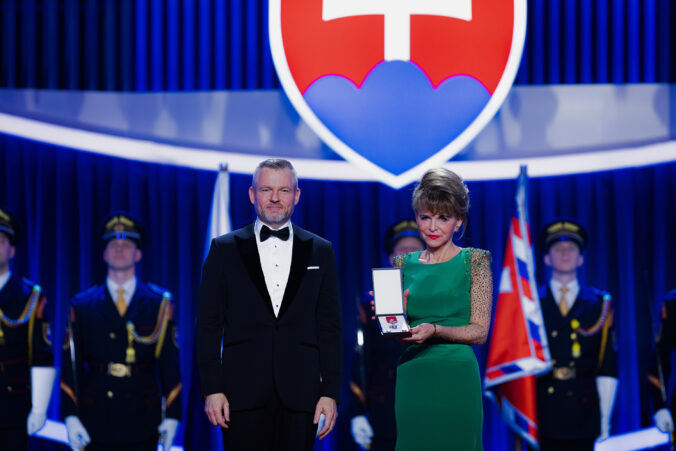 V popredí zľava: Prezident SR Peter Pellegrini a autorka knihy Spomienky Kornélie Wirtschafterovej: príbeh židovky, ktorá prežila štyri koncentračné tábory a bývalá riaditeľka Gemersko-malohontského múzea v Rimavskej Sobote Oľga Bodorová, ktorá prevzala Rad Ľudovíta Štúra II. triedy, občiansky druh, za mimoriadne zásluhy o demokraciu a jej rozvoj, ochranu ľudských práv a slobôd Kornélie Wirtschafterovej, počas udeľovania štátnych vyznamenaní osobnostiam z rôznych oblastí spoločenského života pri príležitosti 33. výročia vzniku Slovenskej republiky v Koncertnej sieni Slovenskej filharmónie. Bratislava, 10. január 2026. Foto: SITA/Kancelária prezidenta SR