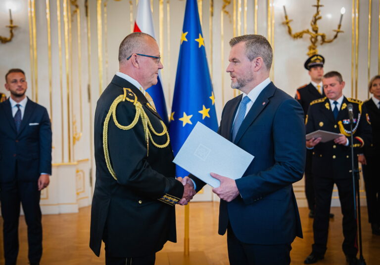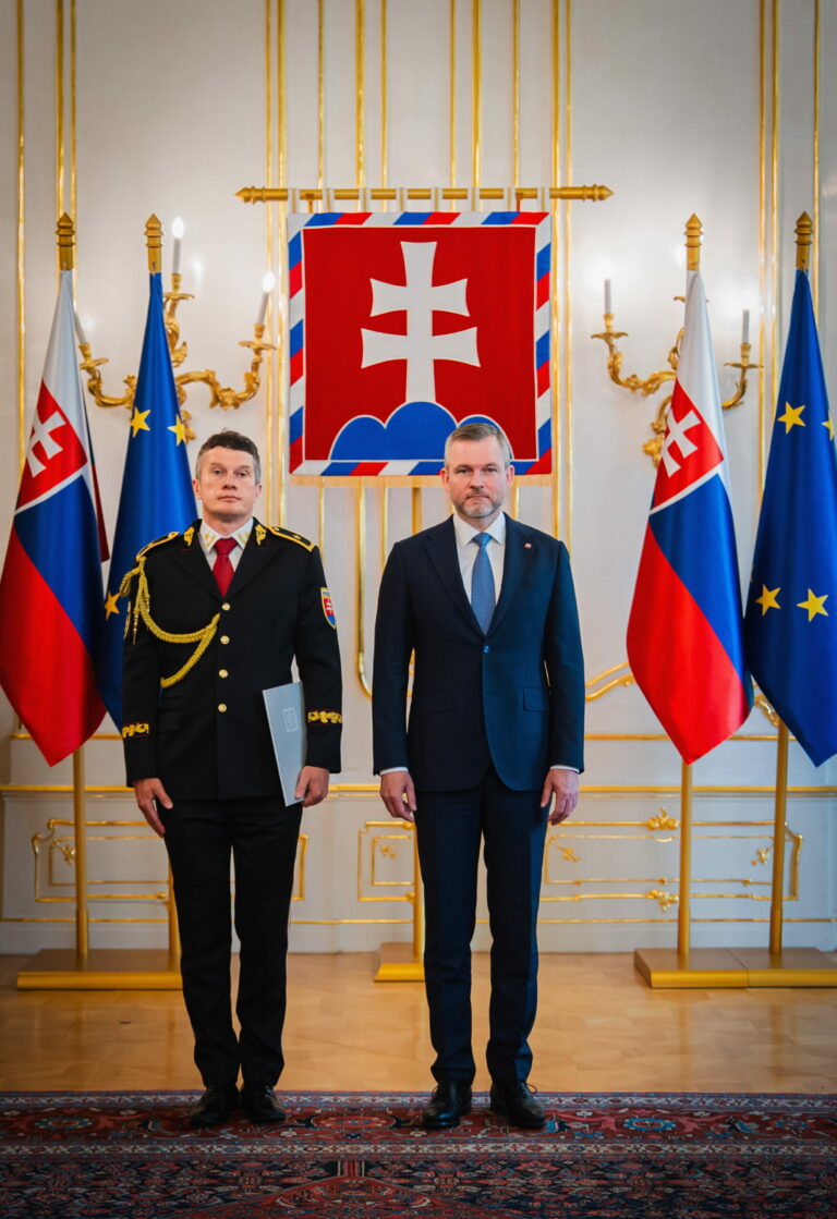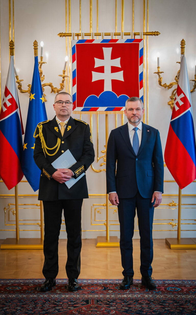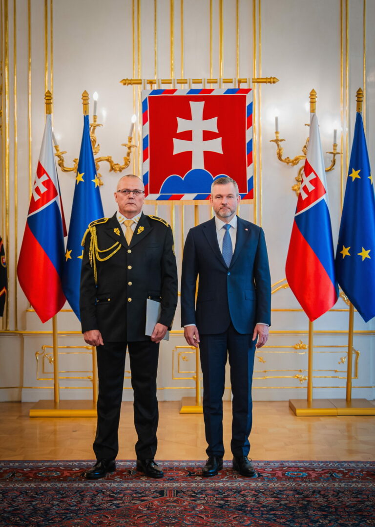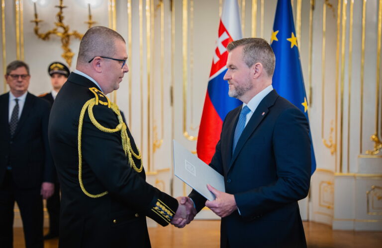 Sprava: Prezident SR Peter Pellegrini a riaditeľ Zboru väzenskej a justičnej stráže (ZVJS) Ľubomír Klištinec vymenovaný do hodnosti generála počas vymenovania generálov v Prezidentskom paláci. Bratislava, 25. apríl 2025. Foto: SITA/Kancelária prezidenta