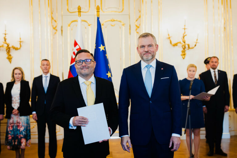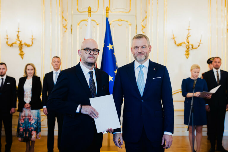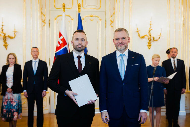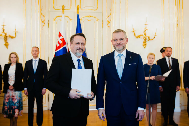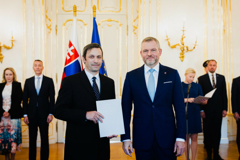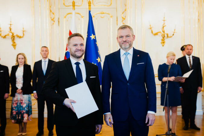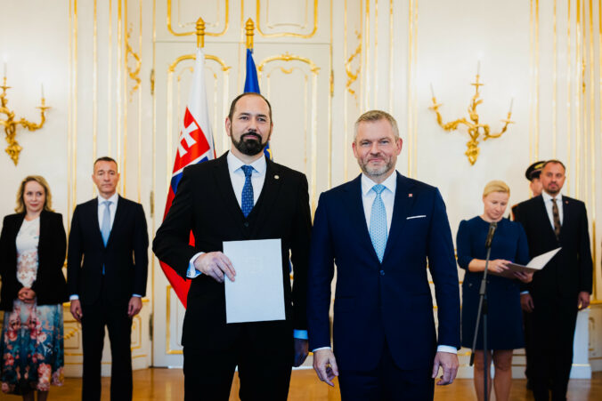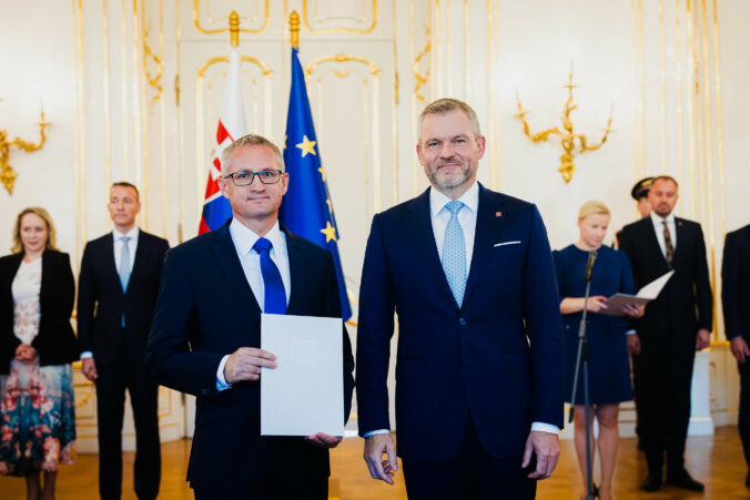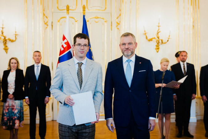 Minister školstva, výskumu, vývoja a mládeže SR Tomáš Drucker (vpravo) počas vymenovania profesorov vysokých škôl prezidentom SR v Prezidentskom paláci. Bratislava, 6. november 2025. Foto: SITA/Kancelária prezidenta SR