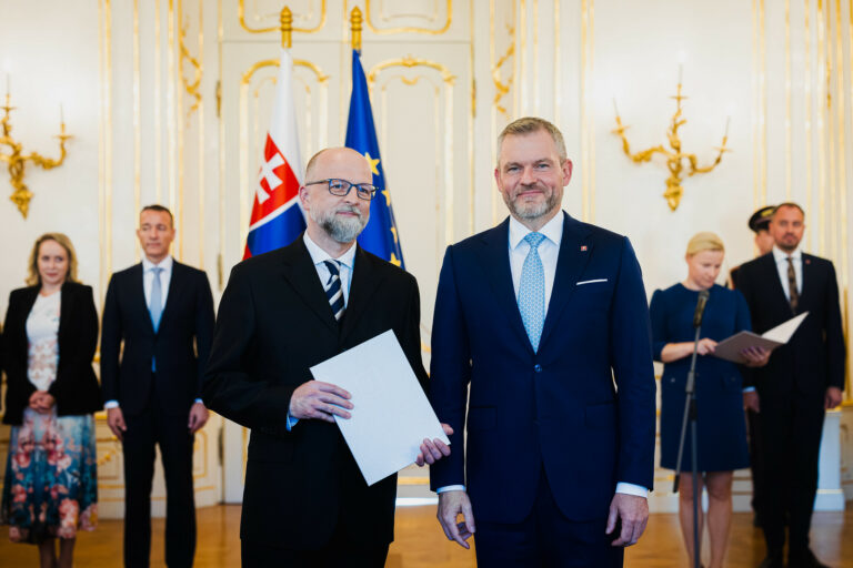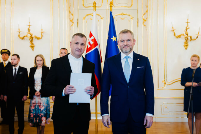 V popredí zľava: Vymenovaný profesor v odbore procesná technika Peter Peciar a prezident SR Peter Pellegrini počas vymenovania profesorov vysokých škôl v Prezidentskom paláci. Bratislava, 6. november 2025. Foto: SITA/Kancelária prezidenta SR