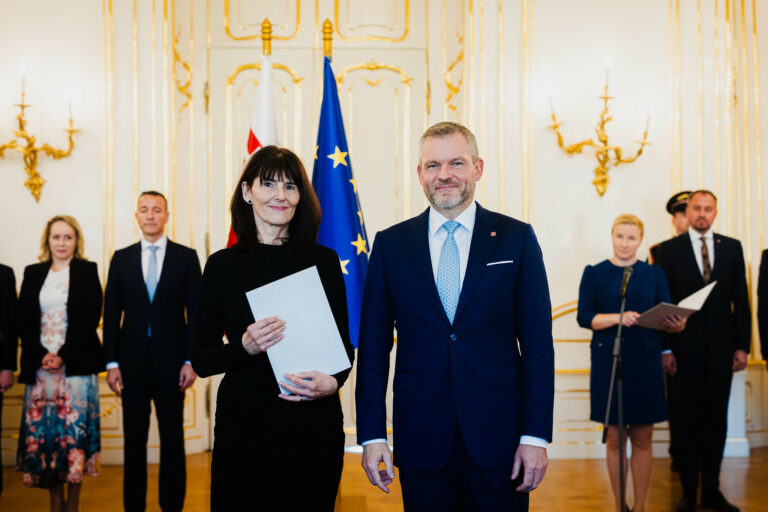 V popredí zľava: Vymenovaná profesorka v odbore manažment Daniela Špirková a prezident SR Peter Pellegrini počas vymenovania profesorov vysokých škôl v Prezidentskom paláci. Bratislava, 6. november 2025. Foto: SITA/Kancelária prezidenta SR