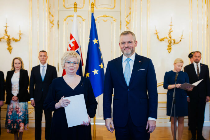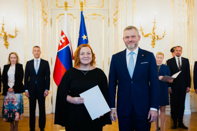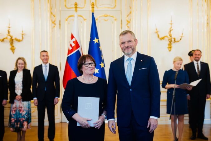 V popredí zľava: Vymenovaná profesorka v odbore slovanské jazyky a literatúry Anna Petríková a prezident SR Peter Pellegrini počas vymenovania profesorov vysokých škôl v Prezidentskom paláci. Bratislava, 6. november 2025. Foto: SITA/Kancelária prezidenta SR