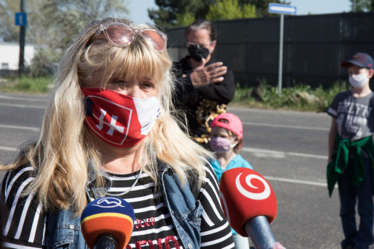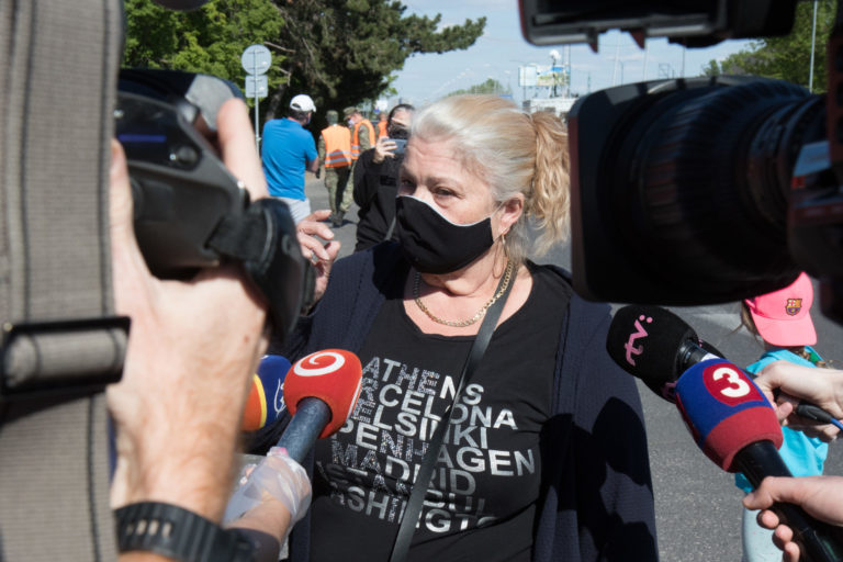 Opatrovateľka pracujúca v Rakúsku Mária Šošovicová počas protestu na hraničnom priechode Bratislava - Berg za uznanie výsledkov zahraničných testov na COVID-19 aj na Slovensku z dôvodu, aby pendleri nemuseli ísť do štátnej karantény. Bratislava, 26. apríl 2020. Foto: SITA/Ľudovít Vaniher.