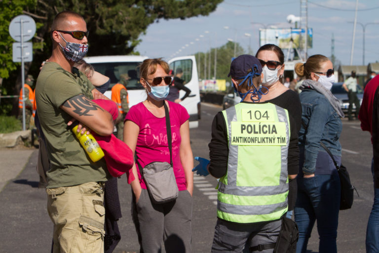 Slovenskí opatrovatelia pracujúci v Rakúsku počas protestu na hraničnom priechode Bratislava - Berg za uznanie výsledkov zahraničných testov na COVID-19 aj na Slovensku z dôvodu, aby pendleri nemuseli ísť do štátnej karantény. Bratislava, 26. apríl 2020. Foto: SITA/Ľudovít Vaniher.