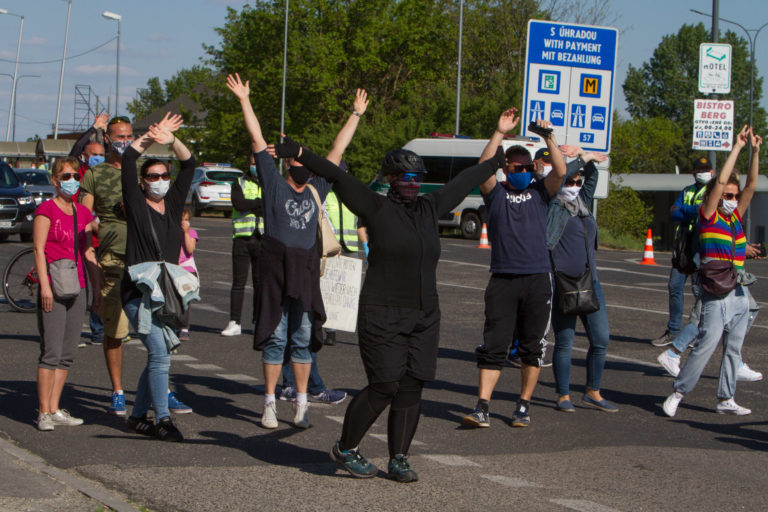 Slováci pracujúci v Rakúsku počas protestu na hraničnom priechode Bratislava - Berg za uznanie výsledkov zahraničných testov na COVID-19 aj na Slovensku z dôvodu, aby nemuseli ísť do štátnej karantény. Bratislava, 26. apríl 2020. Foto: SITA/¼udovít Vaniher Foto: SITA/Ľudovít Vaniher.