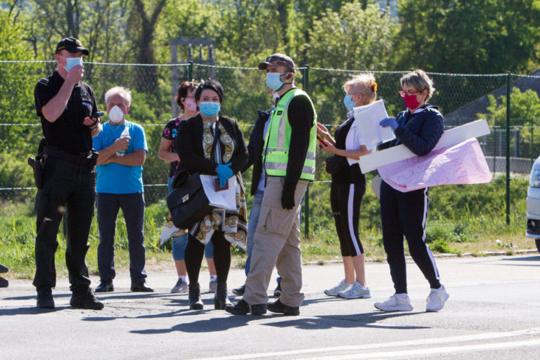 Slovenskí opatrovatelia pracujúci v Rakúsku počas protestu na hraničnom priechode Bratislava - Berg za uznanie výsledkov zahraničných testov na COVID-19 aj na Slovensku z dôvodu, aby nemuseli ísť do štátnej karantény. Bratislava, 26. apríl 2020. Foto: SITA/Ľudovít Vaniher.