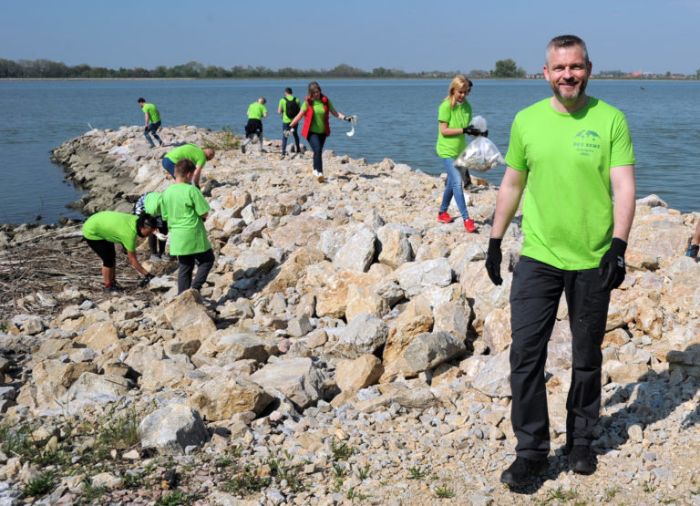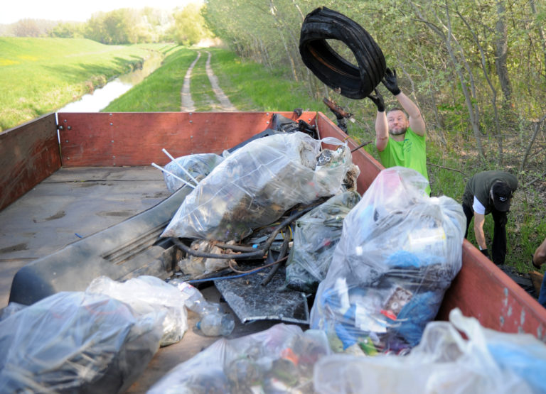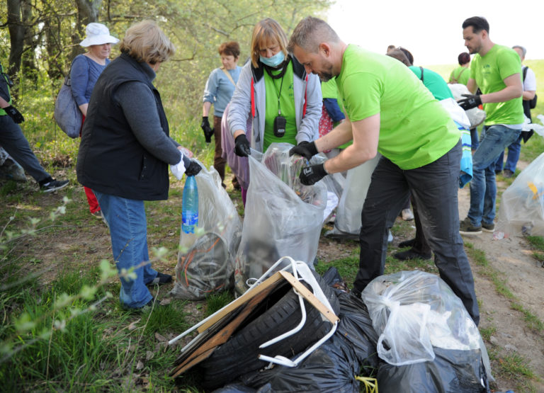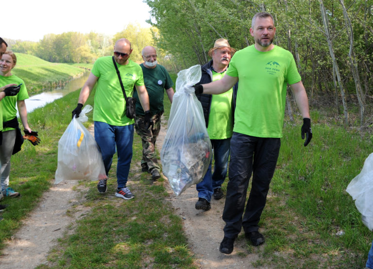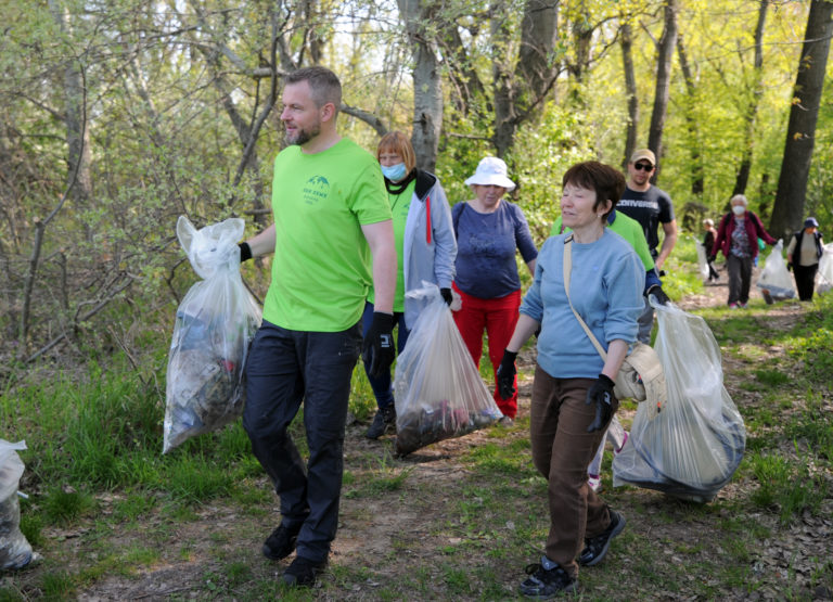Predseda strany HLAS - sociálna demokracia Peter Pellegrini (vpravo v popredí) zbiera odpadky v prírode v obci Šoporňa v rámci aktivít strany HLAS-SD, zameraných na ochranu životného prostredia pri príležitosti osláv Sviatku práce. Šoporňa, 1. máj 2021. Foto: SITA/Martin Havran