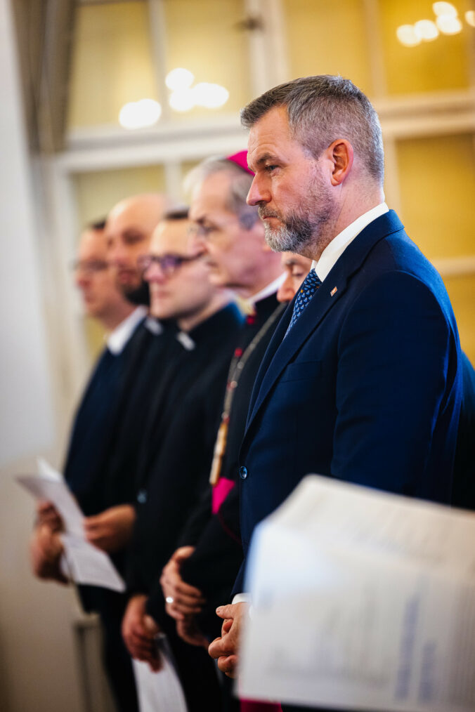 Prezident SR Peter Pellegrini (v popredí) počas podujatia Deň odprosenia – ekumenickej bohoslužby pokánia a prosby o odpustenie, pripravovaného v spolupráci Konferenciou biskupov Slovenska a Ekumenickej rady cirkví na Slovensku v Historickej budove Národnej rady SR pri príležitosti Jubilejného roka 2025. Bratislava, 16. november 2025. Foto: SITA/Kancelária prezidenta SR