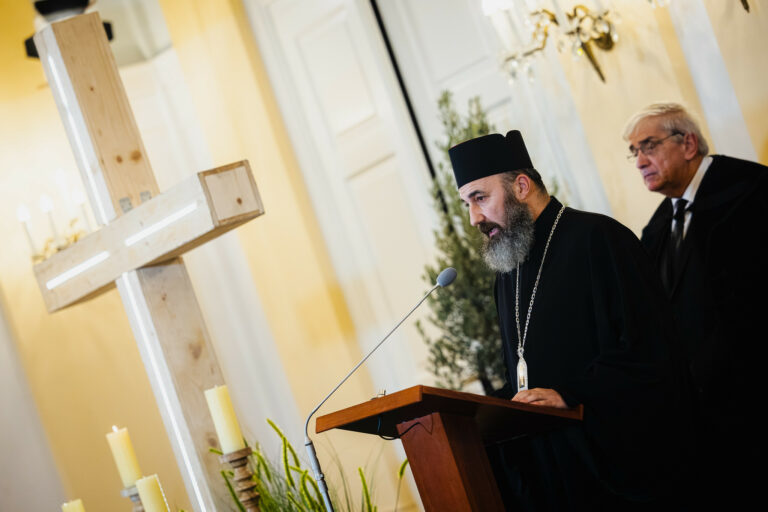 Prešovský arcibiskup a metropolita Gréckokatolíckej cirkvi na Slovensku vladyka Jonáš Maxim (vľavo) počas podujatia Deň odprosenia – ekumenickej bohoslužby pokánia a prosby o odpustenie, pripravovaného v spolupráci Konferenciou biskupov Slovenska a Ekumenickej rady cirkví na Slovensku v Historickej budove Národnej rady SR pri príležitosti Jubilejného roka 2025. Bratislava, 16. november 2025. Foto: SITA/Kancelária prezidenta SR