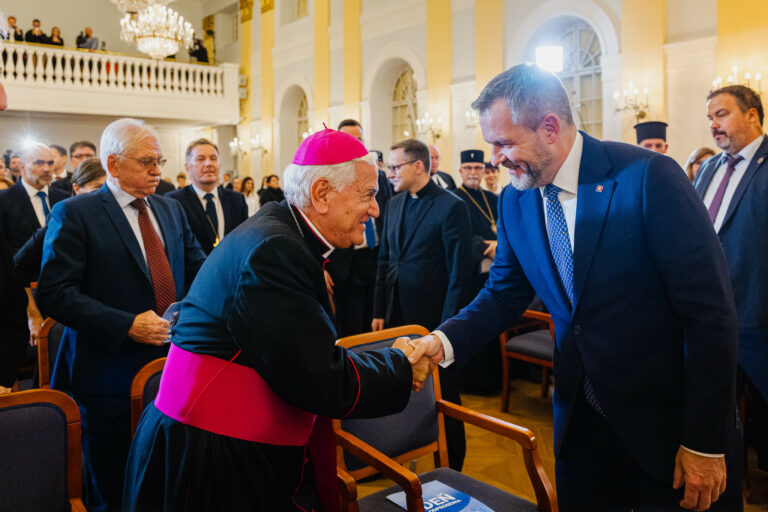 V popredí zľava: Apoštolský nuncius na Slovensku Nicola Girasoli a prezident SR Peter Pellegrini počas podujatia Deň odprosenia – ekumenickej bohoslužby pokánia a prosby o odpustenie, pripravovaného v spolupráci Konferenciou biskupov Slovenska a Ekumenickej rady cirkví na Slovensku v Historickej budove Národnej rady SR pri príležitosti Jubilejného roka 2025. Bratislava, 16. november 2025. Foto: SITA/Kancelária prezidenta SR