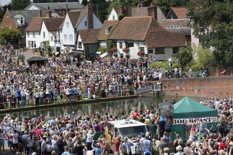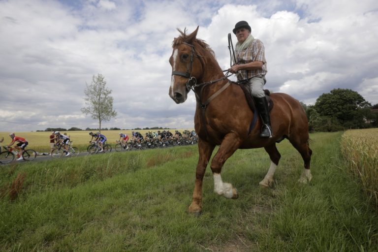 Fanúšik na koni počas tretej etapy 101. ročníka Tour de France, ktorá merala 155 kilometrov a viedla z Cambridgeu do Londýna. Foto: SITA/AP