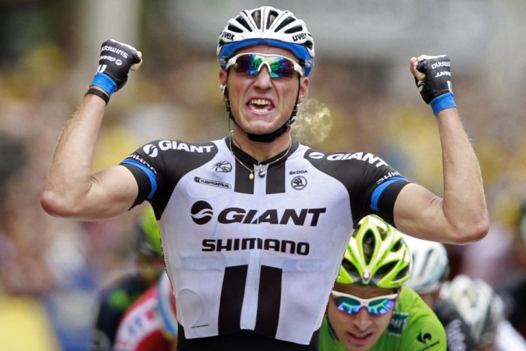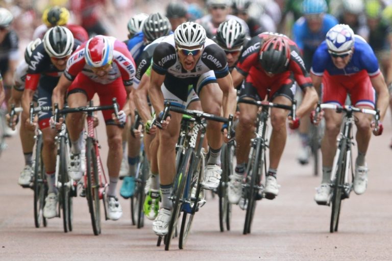 Záverečný špurt tretej etapy 101. ročníka Tour de France ovládol Nemec Marcel Kittel, slovenský cyklista Peter Sagan skončil na skvelom druhom mieste. Foto: SITA/AP