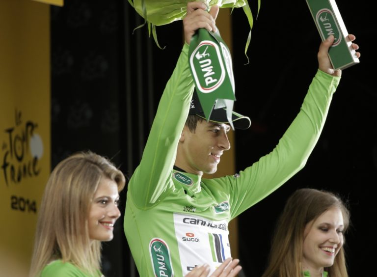 Slovenský cyklista Peter Sagan si aj po tretej etape 101. ročníka Tour de France na pódiu obliekol zelený dres lídra bodovacej súťaže. Foto: SITA/AP