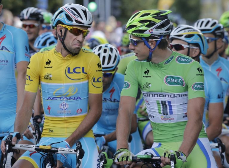 Taliansky cyklista Vincenzo Nibali a Slovák Peter Sagan pred treťou etapou 101. ročníka Tour de France, ktorá merala 155 kilometrov a viedla z Cambridgeu do Londýna. Foto: SITA/AP