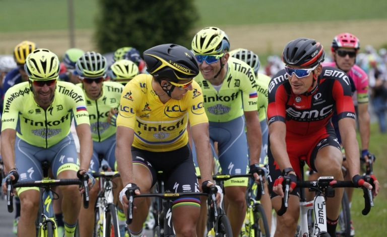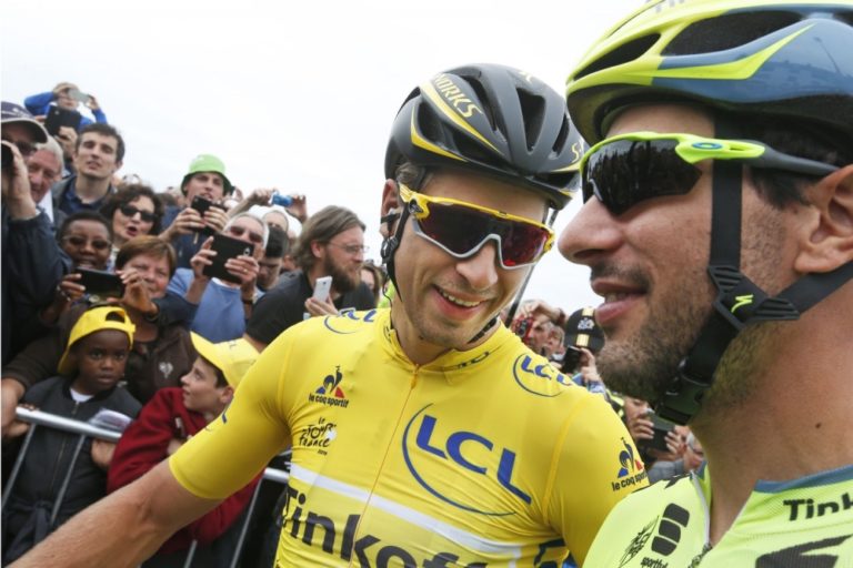 Slovenský cyklista Peter Sagan s tímovým kolegom Oscarom Gattom z Tinkoffu pred treťou etapou 103. ročníka Tour de France, ktorá merala 223,5 kilometra a viedla z Granville do Angers. (4. júl 2016) Foto: SITA/AP