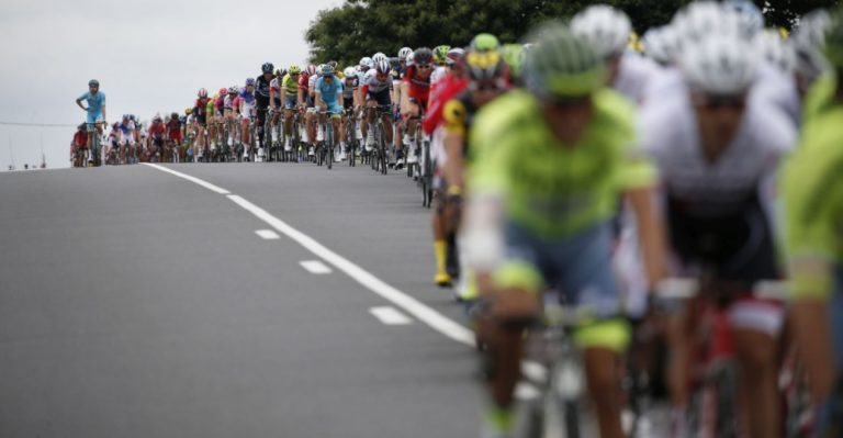 Záverečný špurt o triumf v tretej etape 103. ročníka Tour de France, ktorá merala 223,5 kilometra a viedla z Granville do Angers, vyhral Brit Mark Cavendish (v zelenom). Slovenský cyklista Peter Sagan (v žltom) finišoval na štvrtom mieste. (4. júl 2016). Foto: SITA/AP