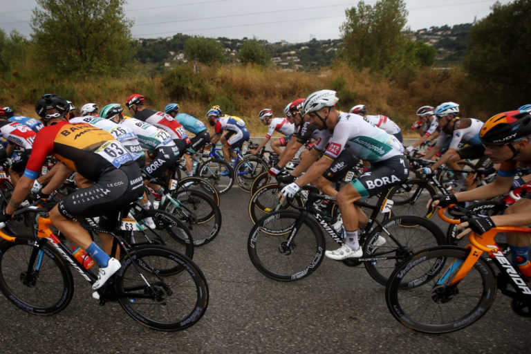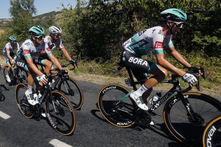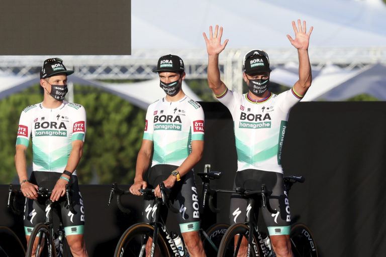 Cyklisti tímu Bora-Hansgrohe Maximilian Schachmann, Peter Sagan a Daniel Oss pred štartom 12. etapy Tour de France 2020 zo Chauvigny do Sarranu (218 km). Chauvigny, 10. september 2020. Foto: SITA/AP.