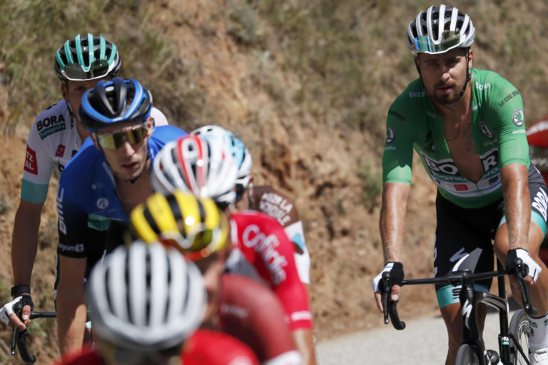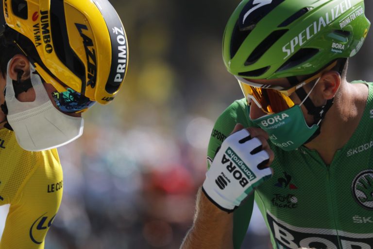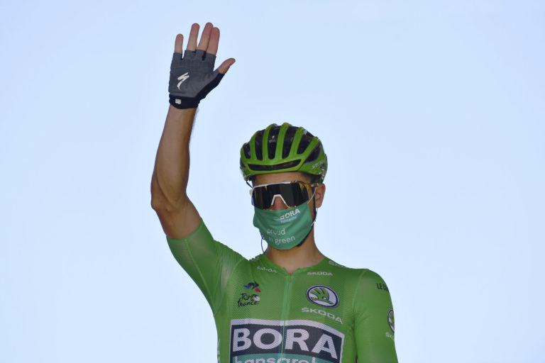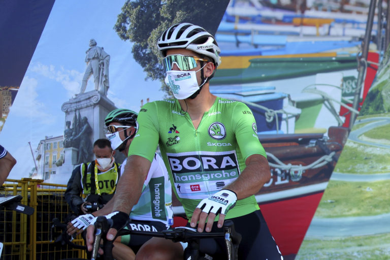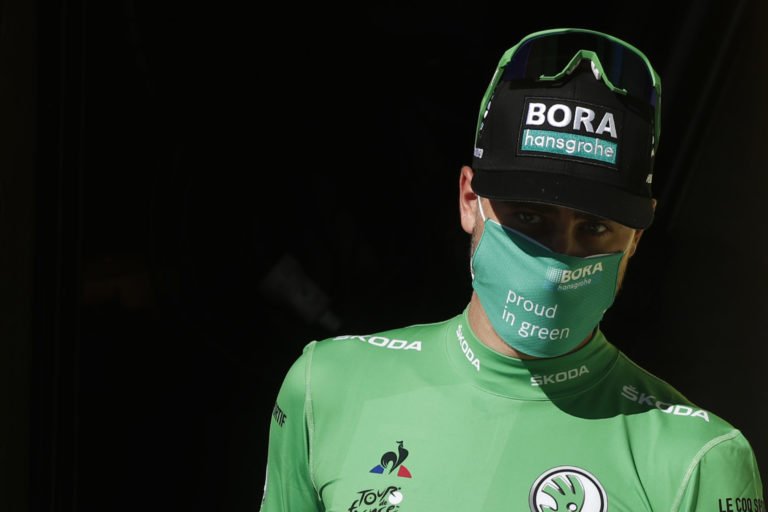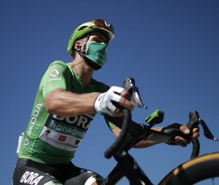 Slovenský cyklista Peter Sagan (Bora-Hansgrohe) pred štartom ôsmej etapy Tour de France 2020 so štartom Cazères sur Garonne a cieľom v Loudenvielle. Cazères sur Garonne, 5. september 2020. Foto: Christophe Petit-Tesson/Pool via AP.