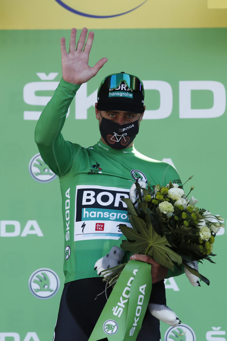 Slovakia's Peter Sagan wearing the best sprinter's green jersey celebrates on the podium after the third stage of the Tour de France cycling race over 198 kilometers (123 miles), with start in Nice and finish in Sisteron, southern France, Monday, Aug. 31, 2020. () Foto: Benoit Tessier, Pool via AP.