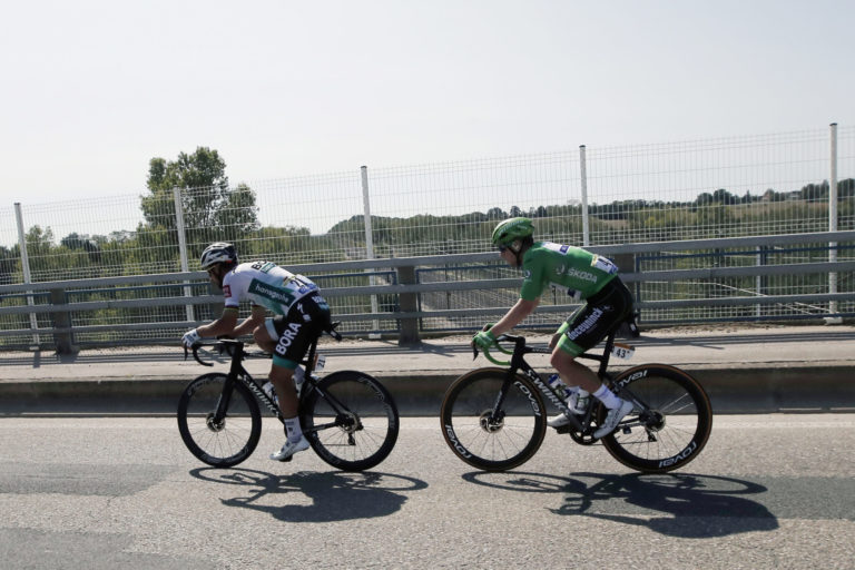 Zľava: Peter Sagan a Sam Bennett v drese lídra bodovacej súťaže počas 15. etapy Tour de France 2020 z Lyonu na Grand Colombier (174,5 km). Foto: SITA/AP.