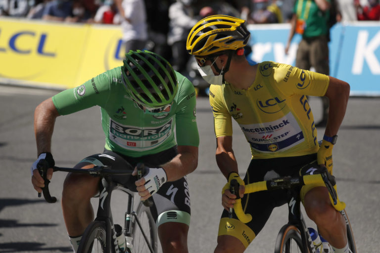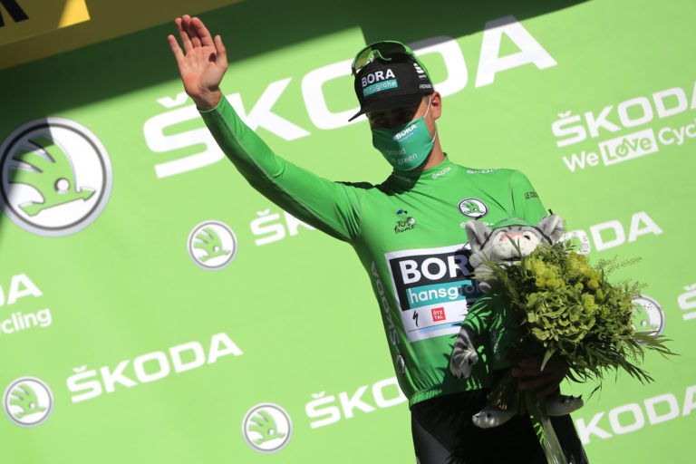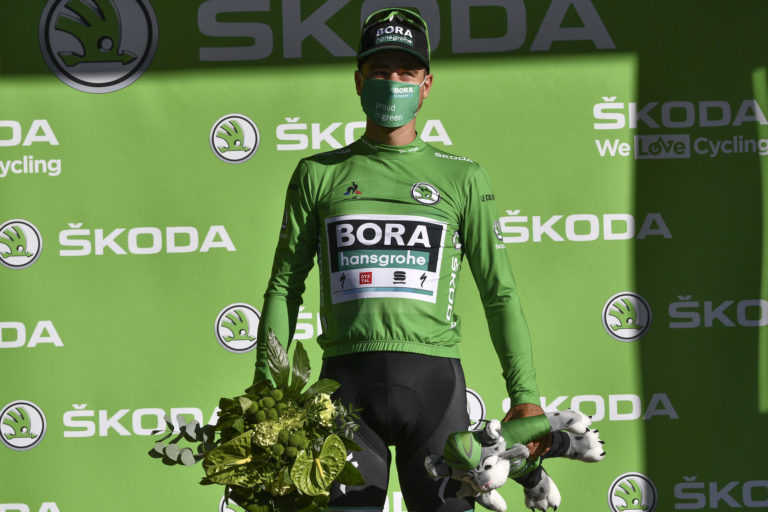 Slovenský cyklista Peter Sagan (Bora-Hansgrohe) v zelenom drese lídra bodovacej súťaže na pódiu po 4. etape Tour de France 2020 zo Sisteronu na vrchol stúpania v Orcières-Merlette. Orcières-Merlette, 1. september 2020. Foto: Anne-Christine Poujoulat, Pool via AP.