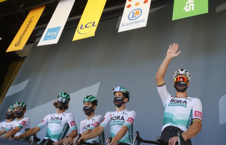Jazdci tímu Bora-Hansgrohe spolu so Slovákom Petrom Saganom, vpravo, pred štartom 7. etapy Tour de France 2020. 4. september 2020 Foto: SITA/AP