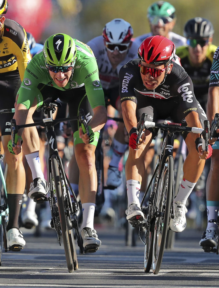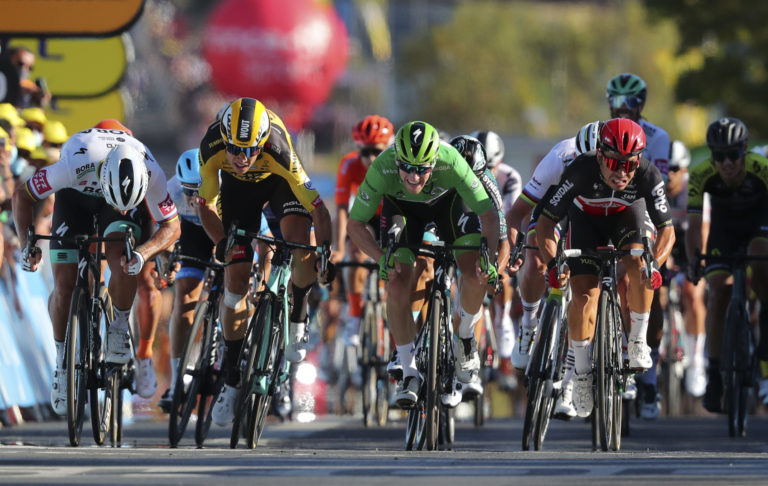 Sam Bennett sa teší z triumfu v 10. etape Tour de France 2020, Peter Sagan (v zelenom) finišoval na tretej priečke. Ile d'Oleron to Ile de Re, 8. september 2020. Foto: SITA/AP.