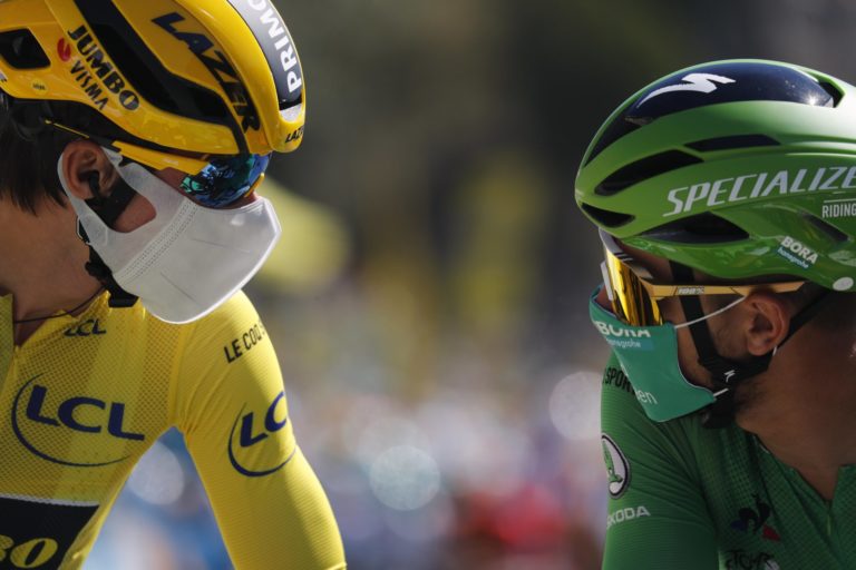 Primož Roglič, vľavo, a Peter Sagan v zelenom drese lídra bodovacieho poradia čakajú na odštartovanie 10. etapy Tour de France 2020. 8. september 2020