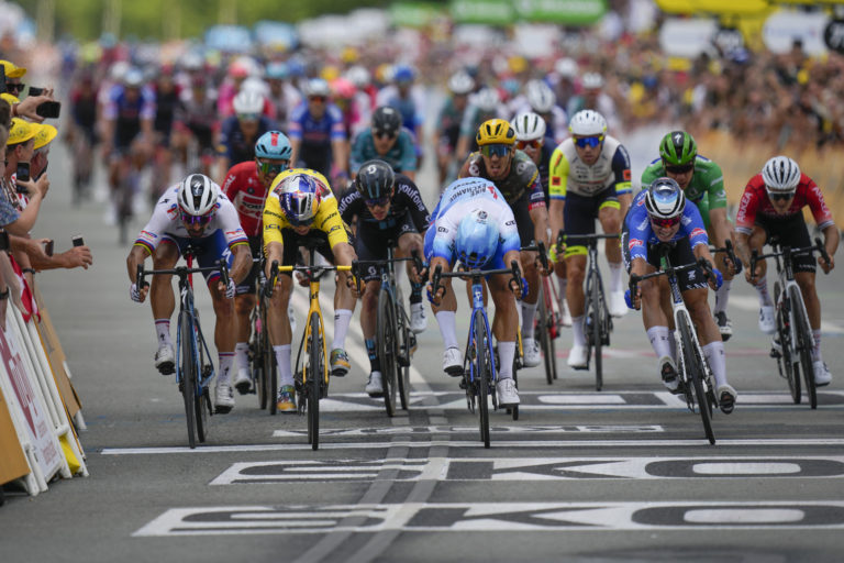 Víťaz etapy Holanďan Dylan Groenewegen (vpravo) pretína cieľovú čiaru pred druhým Belgičanom Woutom Van Aertom v žltom drese celkového lídra, zatiaľ čo Slovák Peter Sagan (vľavo) ukazuje prstom a sťažuje sa neho. Išlo o tretiu etapu cyklistických pretekov Tour de France s viac ako 182 kilometrov (113 míľ) so štartom vo Vejle a cieľom v Sonderborgu. Dánsko, nedeľa 3. júla 2022.