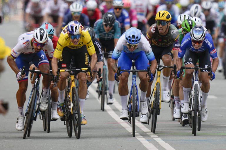Víťaz etapy Holanďan Dylan Groenewegen (v strede), druhý je Belgičan Wout Van Aert v žltom drese celkového lídra, tretí bol Belgičan Jasper Philipsen (vpravo) a Slovák Peter Sagan (vľavo) skončil až štvrtý. Foto: SITA/AP