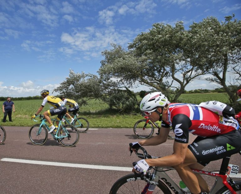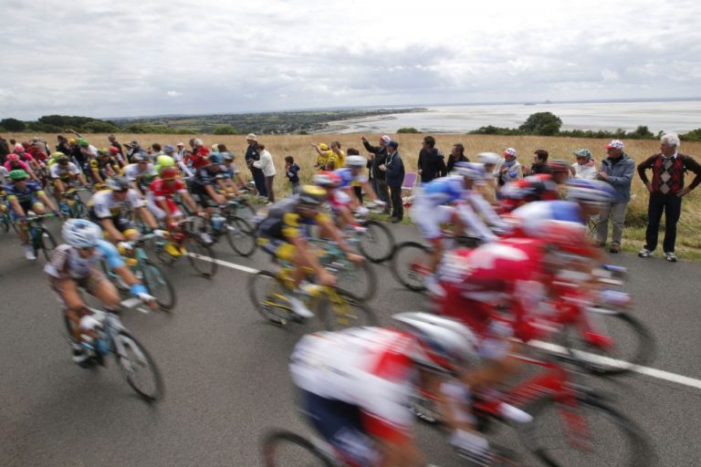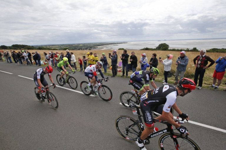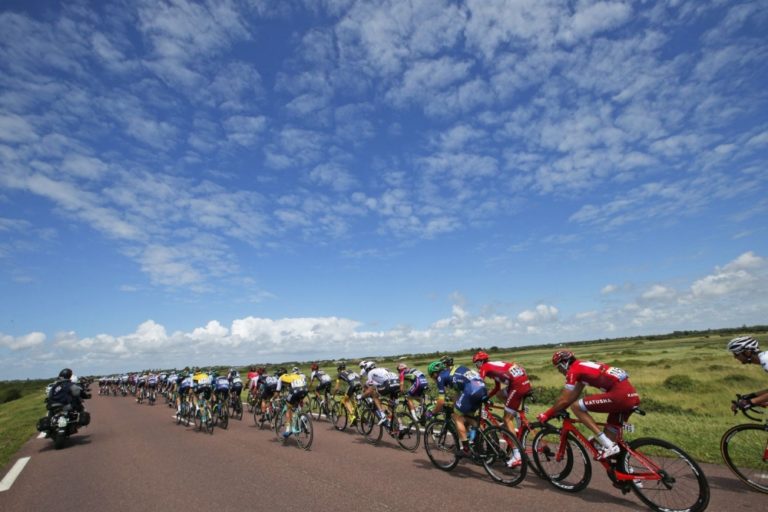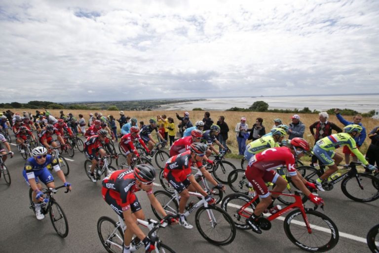 Cyklisti počas prvej etapy 103. ročníka Tour de France, ktorá merala 188 kilometrov a viedla z Mont-Saint-Michel do Utah Beach Sainte-Marie-du-Mont. (2. júl 2016). Foto: SITA/AP