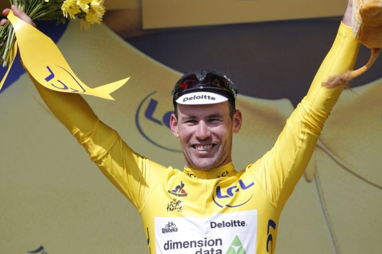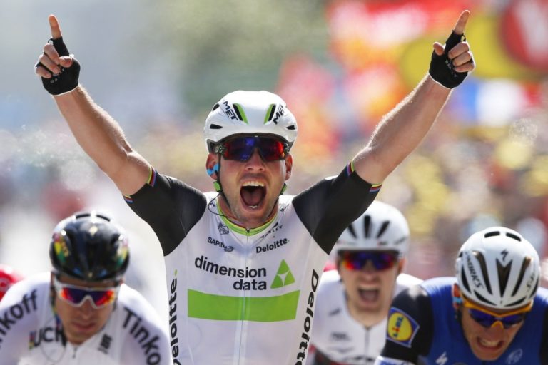Britský cyklista Mark Cavendish sa raduje z triumfu v prvej etape 103. ročníka Tour de France, ktorá merala 188 kilometrov a viedla z Mont-Saint-Michel do Utah Beach Sainte-Marie-du-Mont. (2. júl 2016). Foto: SITA/AP