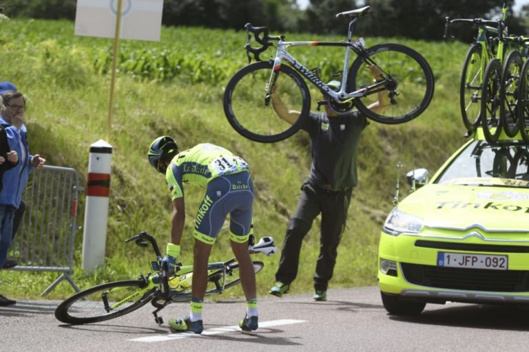 Španielsky cyklista Alberto Contador mal nehodu v prvej etape 103. ročníka Tour de France. Dvojnásobný víťaz spomenutého podujatia nabúral do obrubníka počas prejazdu kruhovým objazdom približne 80 km pred cieľom. (2. júl 2016). Foto: SITA/AP