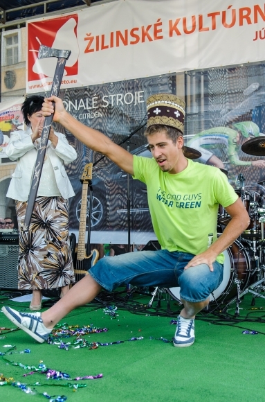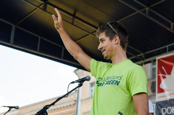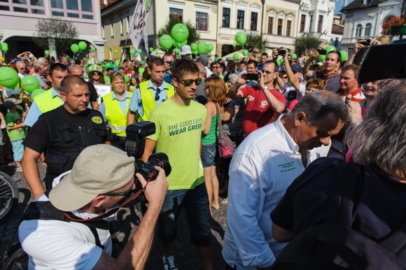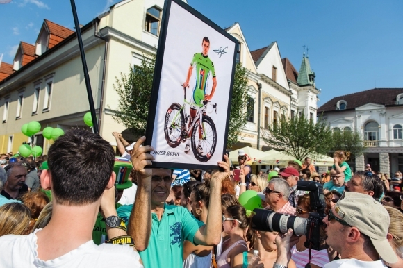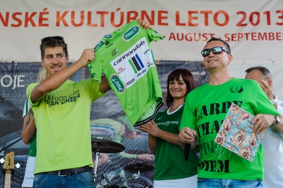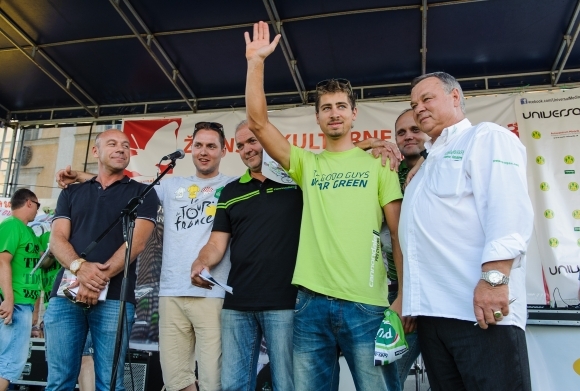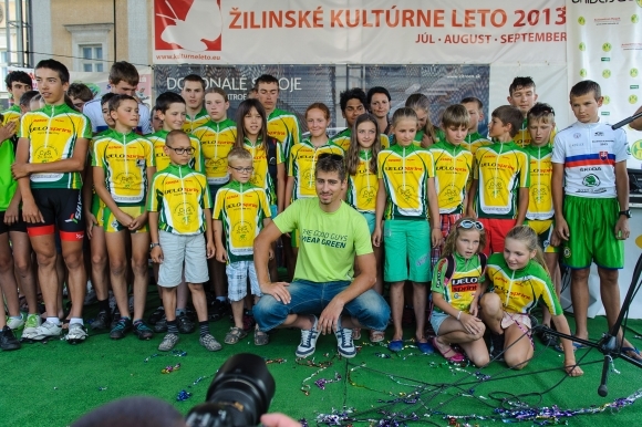 Slovenský cyklista Peter Sagan Peter Sagan (vľavo) so zeleným dresom z Tour de France 2013 počas stretnutia s obyvateľmi mesta Žilina na Mariánskom námestí. Žilina, 23. júl 2013. Foto: SITA/Milo Fabian